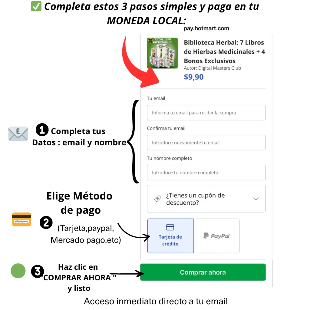 Compra 100% segura con garantía de Hotmart, la plataforma líder en ventas digitales en Latinoamérica. Puedes pagar con tarjeta de crédito/débito, PayPal, efectivo u otros métodos de pago locales. ¡Recibe tu ebook + bonos en minutos tras la confirmación de pago.