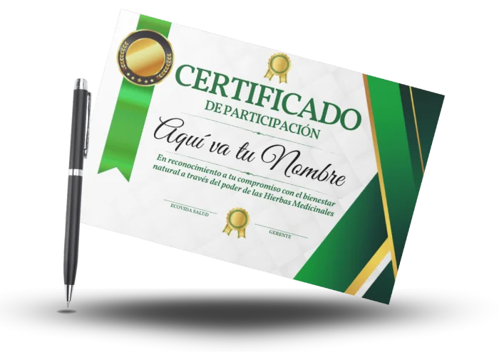 Además, al completar la guía, obtendrás tu Certificado de Participación PERSONALIZADO con tu NOMBRE. Este documento es la prueba de tu esfuerzo y dedicación por transformar tu salud con el poder de las HIERBAS MEDICINALES